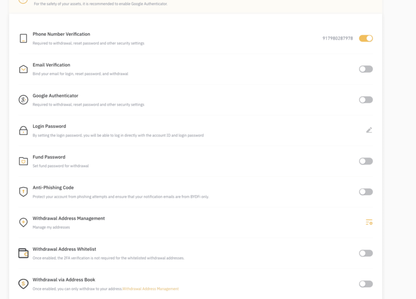 A BYDFi é uma exchange relativamente segura, sem nenhum incidente específico da plataforma relatado até o momento. Além disso, a bolsa possui diversas implementações de segurança, permitindo aos usuários negociar com tranquilidade. Algumas das medidas mais impactantes incluem: