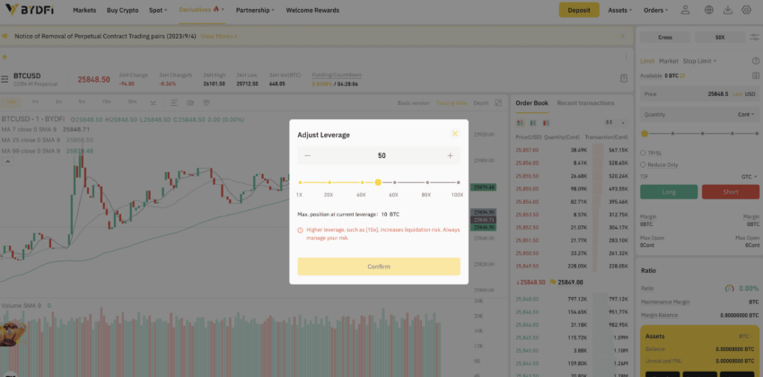 Na BYDFi, é possível negociar esses contratos, e isso também com alavancagem de até 100x. No entanto, é aconselhável manter a alavancagem inferior para minimizar os riscos de liquidação.