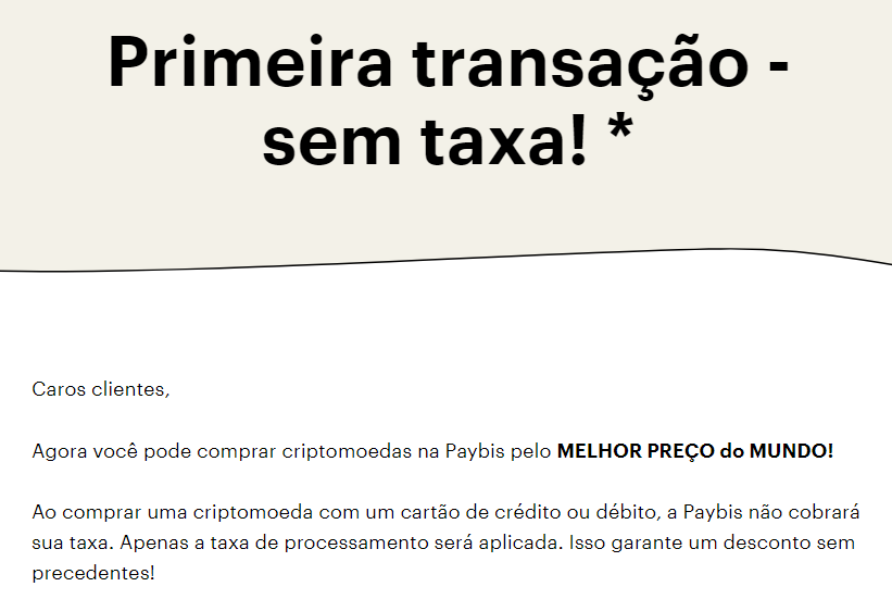 Para começar, a Paybis não oferece um bônus de boas-vindas. No entanto, você pode economizar alguns fundos em sua primeira transação. Para isso, a Paybis não cobra nenhuma taxa. Dependendo do depósito ou dos métodos de pagamento relativos à sua primeira transação, poderá ser necessário pagar as taxas de processamento.