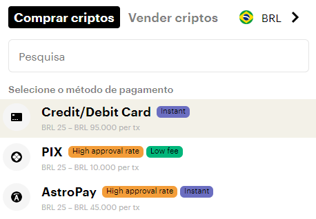 Por exemplo, a Paybis tem um limite mínimo de depósito de US$ 5, o que estabelece uma barreira de entrada baixa que permite que a maioria dos traders comece a comprar e vender criptomoedas. Quanto aos métodos de depósito, a Paybis aceita os seguintes: