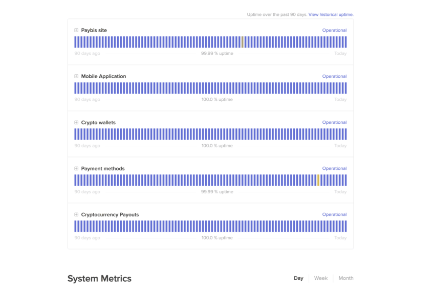 O sistema de suporte ao cliente da Paybis envolve um “Portal de Suporte” dedicado, uma interface que ajuda você a ler artigos relacionados a todas as dúvidas possíveis que um usuário possa ter. Além disso, existe a página de status, que detalha o desempenho histórico de cada UI da Paybis – o site, o aplicativo móvel, a carteira, a zona de pagamento e tudo mais.