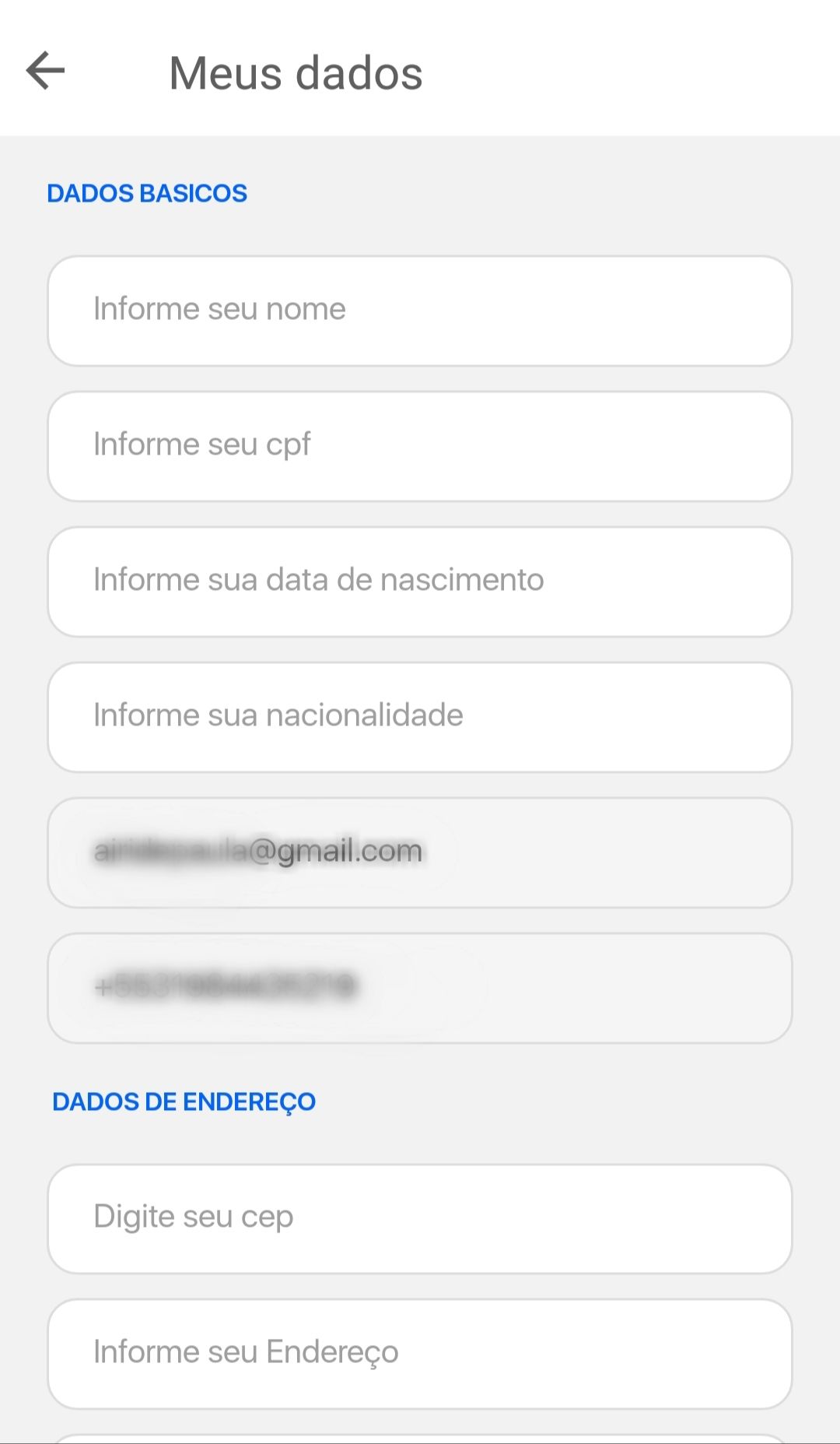 Primeiro, você deve completar os seus dados. Você terá que fornecer informações básicas, como o seu nome, cpf, data de nascimento e nacionalidade.