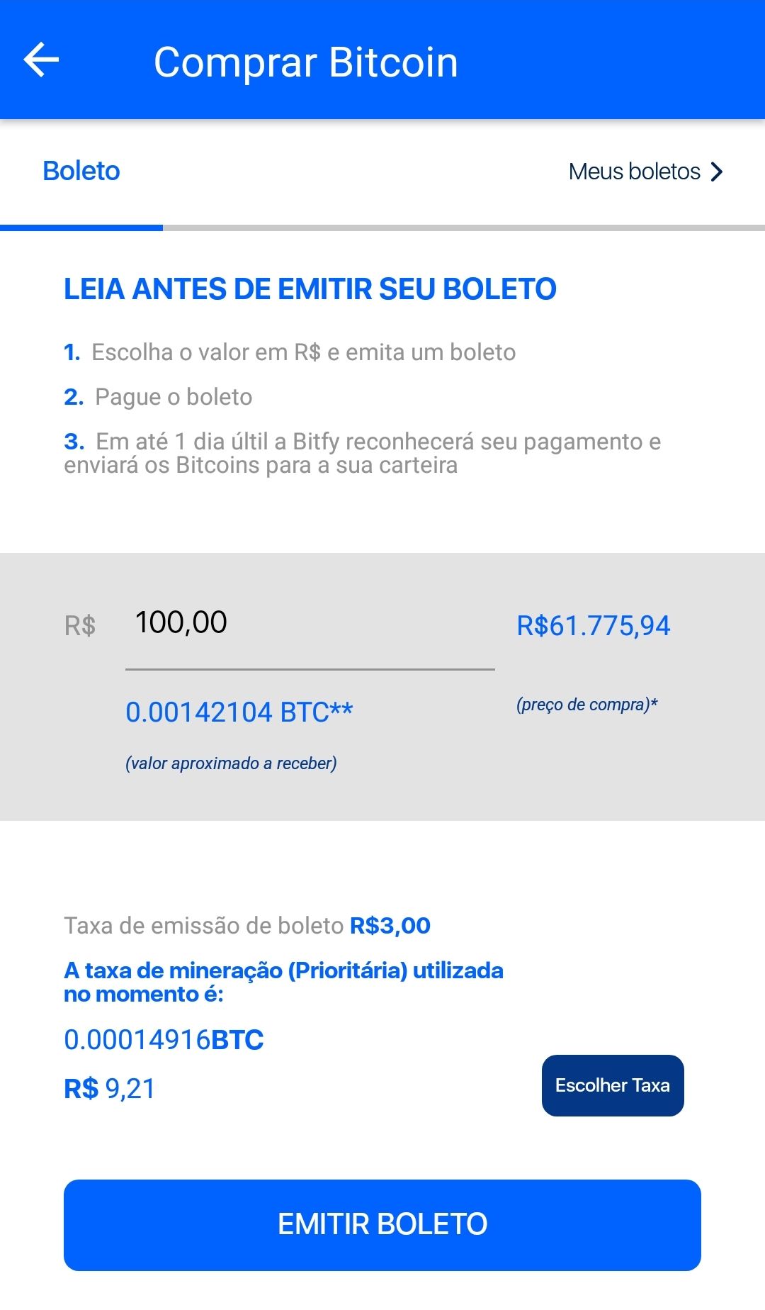 Uma vez conferido o valor em reais e selecionado a taxa de mineração que você queira pagar, é só clicar em “emitir boleto”.