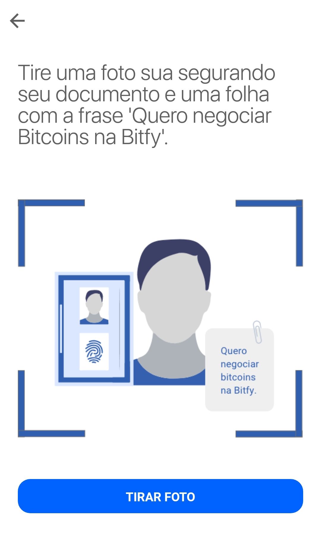 Após informar os dados básicos, é hora de enviar os documentos para validação. O aplicativo solicitará que você envie fotos de um documento de identidade, além de um comprovante de endereço. Para finalizar, você vai ter que enviar uma selfie, com seu documento de identidade, e uma placa escrito “quero negociar bitcoins na Bitfy”.