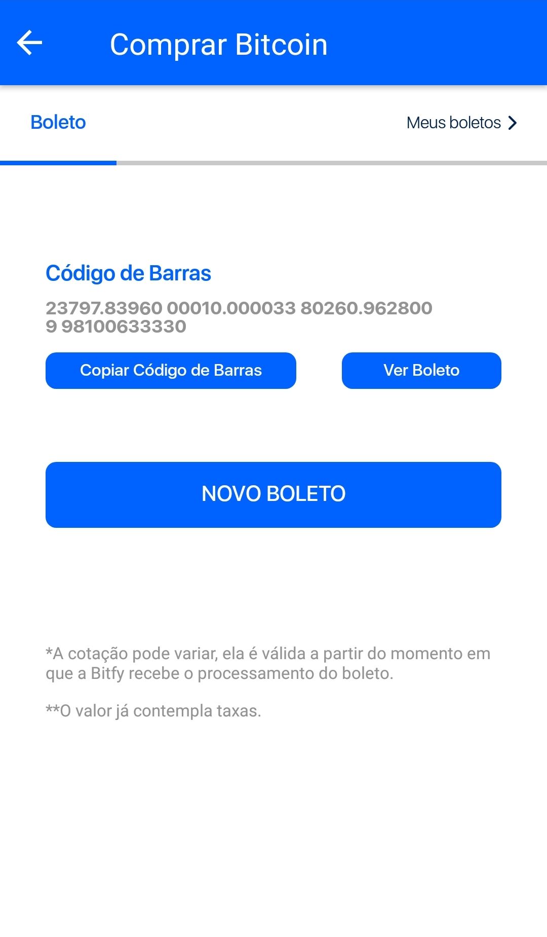 Lembre-se que o valor do bitcoin pode sofrer alterações até o boleto ser processado. Após o pagamento do boleto, seus bitcoins serão depositados na sua conta em até 1 dia útil.