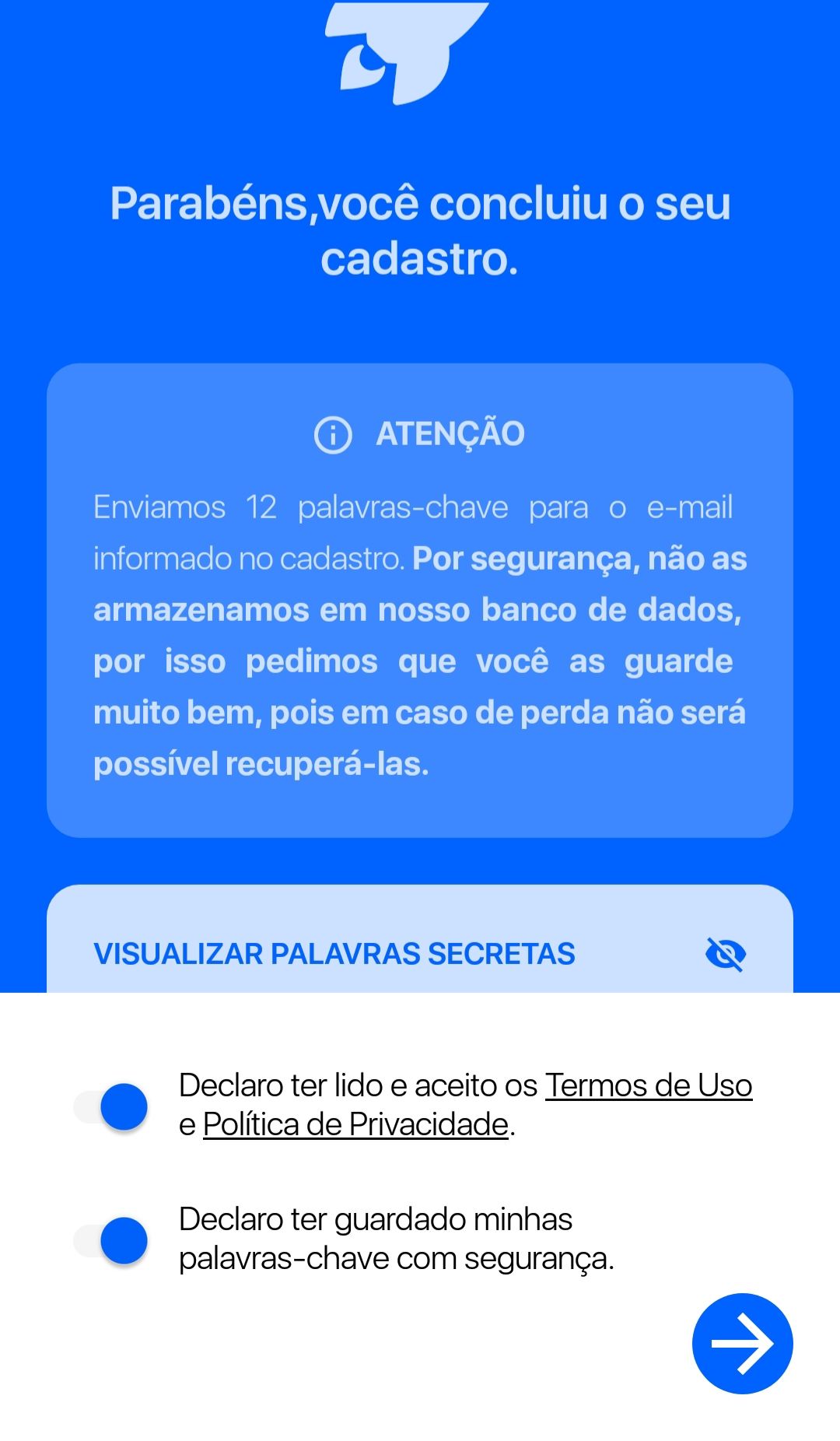 Não se preocupe em memorizar essas palavras, você as receberá pelo e-mail cadastrado. Esse é mais uma etapa de segurança, para proteger ainda mais os seus ativos.