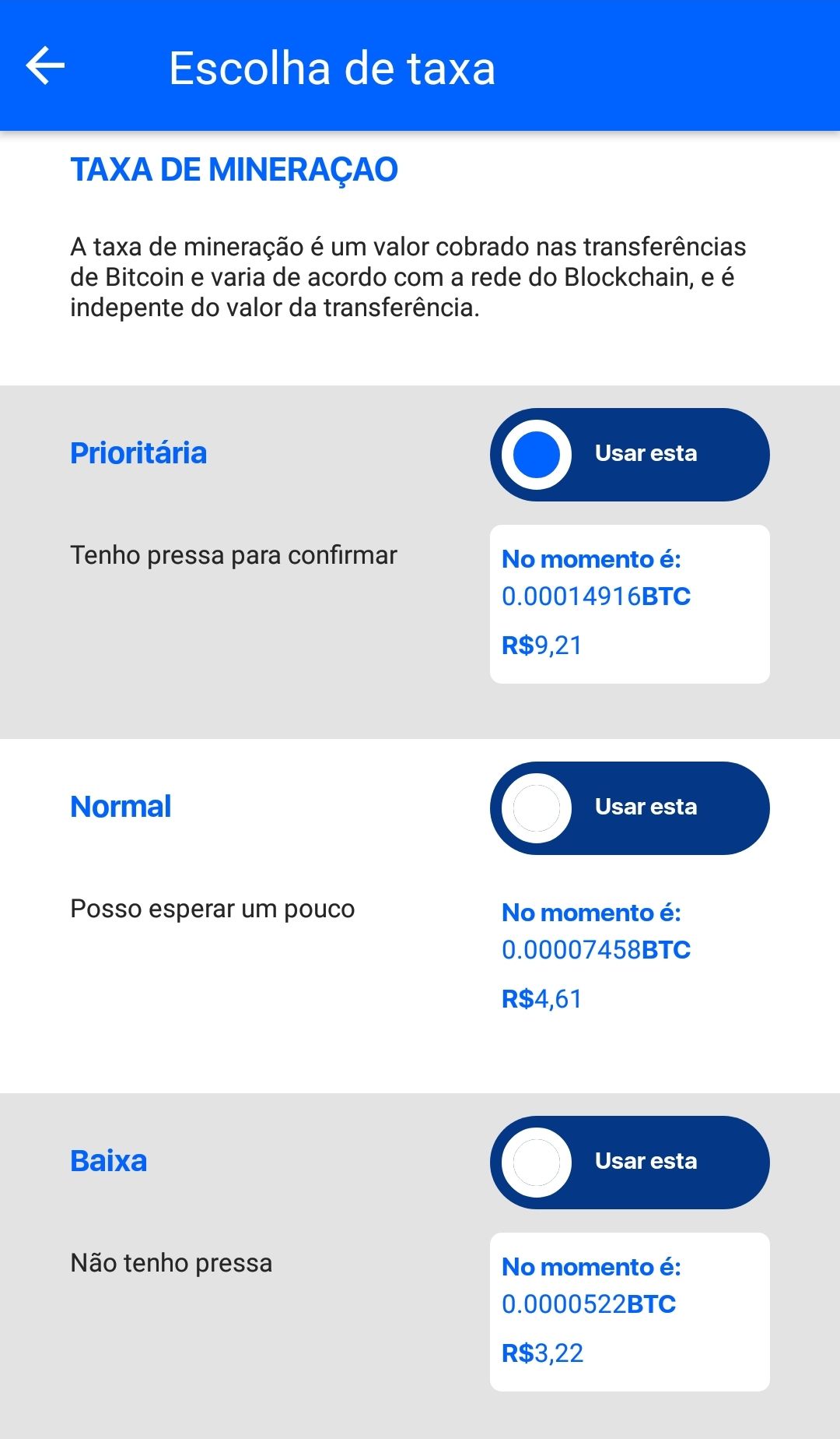 Existem três tipos de taxa de mineração, a prioritária, a normal e a baixa. E a Bitfy permite que você escolha qual taxa pagar.