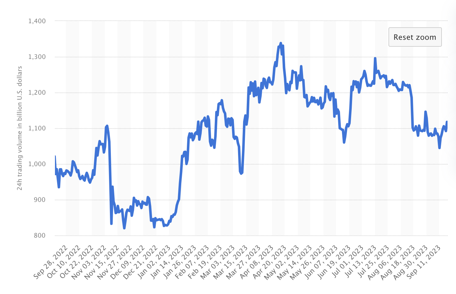 Segundo o portal Statista, o volume geral de negociação de criptomoedas em um período de 24 horas cresceu durante o ano de 2023. O volume de negociação atingiu 1.117 bilhões de dólares em setembro de 2023, implicando na alta liquidez no mercado de criptomoedas.