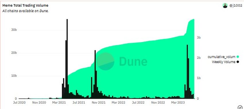 Quando as memecoins vêm à mente, a maioria das pessoas provavelmente pensa em Dogecoin ou Shiba Inu. No entanto, muitas outras criptomoedas semelhantes apareceram desde que o mercado testemunhou ganhos extraordinários com algumas dessas principais moedas de meme. Abaixo está um gráfico que mostra o volume total de negociação atual para memecoins em circulação.