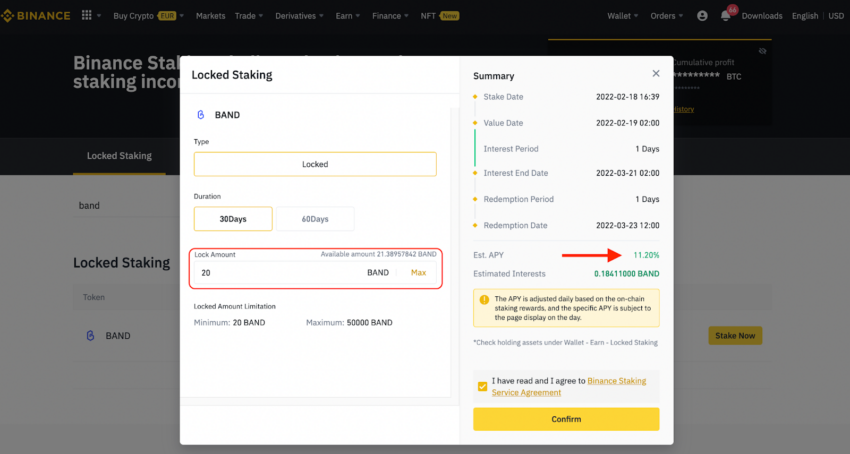 Na Binance, você só pode fazer staking de tokens BAND em Locked Staking. Você pode selecionar entre 30 e 60 dias para bloquear BAND. Clique em Stake Now e insira a quantidade de tokens BAND que deseja bloquear. O valor mínimo é 20 BAND.