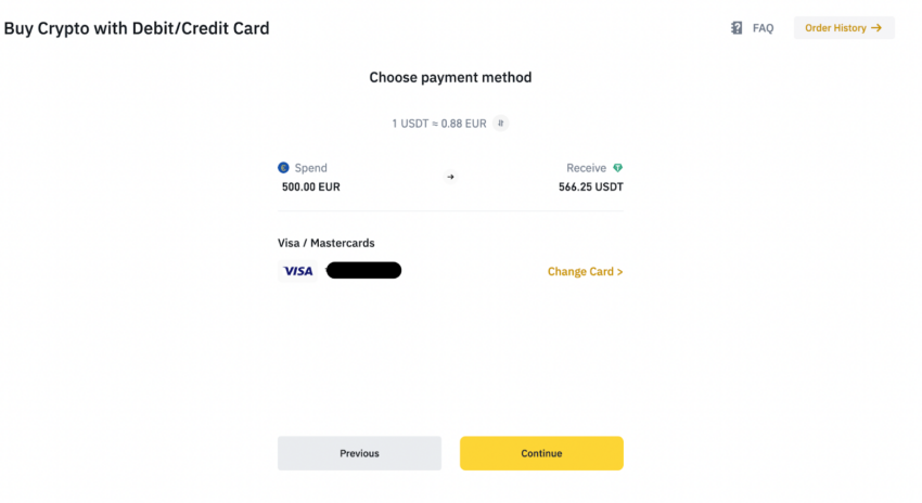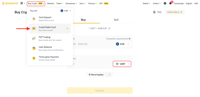 Depois que sua conta for verificada, vá para Comprar criptomoeda e selecione Cartão de crédito/débito. Você pode selecionar sua moeda fiduciária e a criptomoeda desejada. Nesse caso, escolheremos USDT, pois o token BAND não está disponível para compra direta.