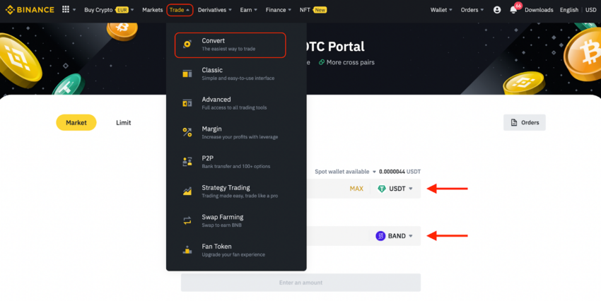 No entanto, se você não está acostumado a definir ordens para comprar criptomoeda, a maneira mais fácil de comprar o token BAND é converter seu USDT usando a opção Converter na Binance. Vá para Trade (menu superior) e selecione Converter .