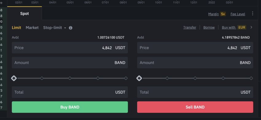 Você verá a tela do mercado, onde você pode definir ordens de mercado para comprar o token BAND.