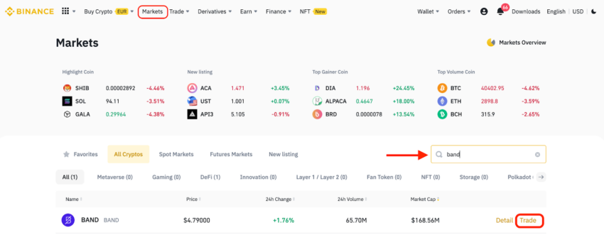 Se você quiser ver como é o mercado, vá para Market (no menu superior) e procure por token BAND. Em seguida, clique em Trade.