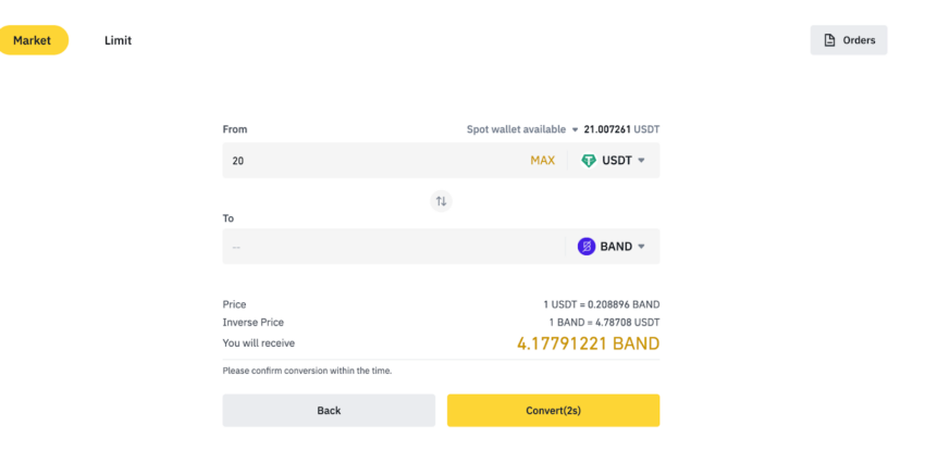Você pode escolher a criptomoeda para converter na caixa. Neste exemplo, converteremos tokens USDT em BAND.