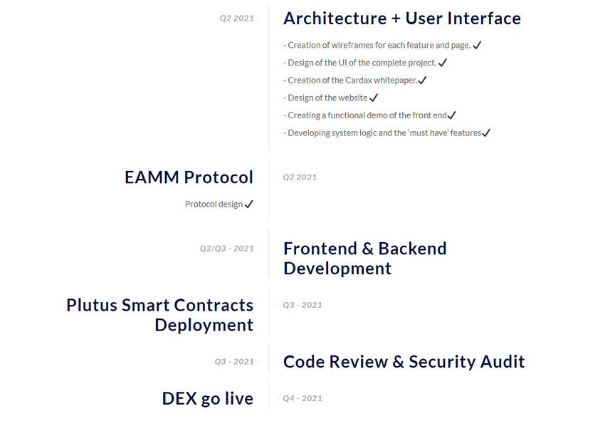 O roteiro da Cardax foi dividido em seis fases, com a primeira focando na arquitetura e UI / UX. Esta fase verá a lógica do sistema, recursos essenciais e uma demonstração funcional lançada, junto com as tarefas de UI / UX.