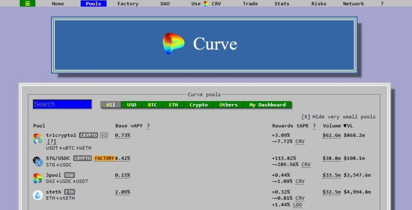 Curve Finance é uma exchange descentralizada bem conhecida. Ao contrário de concorrentes como a Uniswap, o protocolo do Curve não abrange a instabilidade inerente à maioria das criptomoedas. Em vez disso, concentra sua agenda nas trocas de stablecoin.