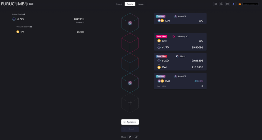 No entanto, também existem interfaces de usuário como a fornecida pelo Furucombo. Isso permite que você use empréstimos relâmpago sem habilidades de codificação. O aplicativo Furucombo ainda está em sua versão beta e pode oferecer alguns resultados inesperados. Use-o por sua conta e risco.