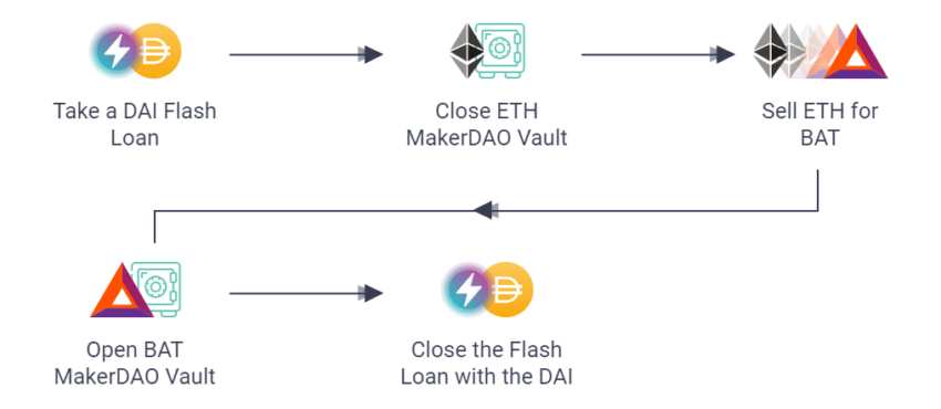 Por exemplo, você pode emprestar fundos dos pools de liquidez da Aave. Então você pode pagar a dívida de volta no protocolo Compound.finance e retirar a garantia do Compound. A garantia pode ser depositada em dYdX, e você pode cunhar dívidas em dYdX, antes de devolver a liquidez em Aave.