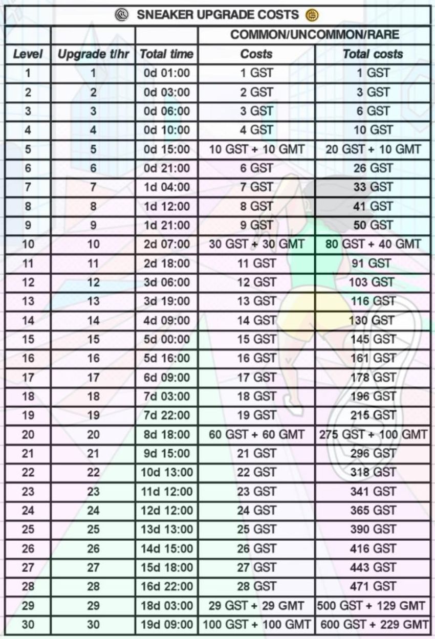 Os tênis NFT têm níveis diferentes. Para atualizar o nível do Sneaker, os usuários precisam queimar tokens GST. Além disso, cada nível tem um tempo fixo. À medida que o tênis aumenta o nível, requer mais GST e tempo. Os usuários também precisarão de tokens GMT para nivelar um tênis para o nível 29 e 30.