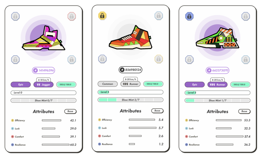 - Tênis: são NFTs que permitem que os usuários comecem a ganhar tokens GST. Os tênis podem ter diferentes atributos (eficiência, sorte, conforto e resiliência) e podem ser atualizados queimando GST e customizados (em desenvolvimento).