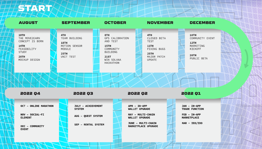 O primeiro design do aplicativo STEPN foi lançado em agosto de 2021 e o teste beta foi concluído em novembro de 2021. O aplicativo está agora na fase beta pública e até o final de 2022 deverá lançar mais recursos, como um multi – atualização de carteira em cadeia e um sistema de aluguel e conquista. O elemento SocialFi deve ser anunciado até o final do ano.