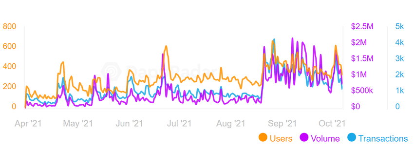 O DApp mais popular é o QuipuSwap, uma exchange descentralizada (DEX) com um criador de mercado automatizado (AMM), semelhante ao Uniswap, mas com um volume muito menor, abaixo de um milhão.