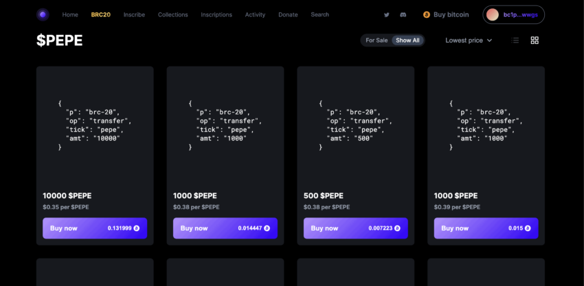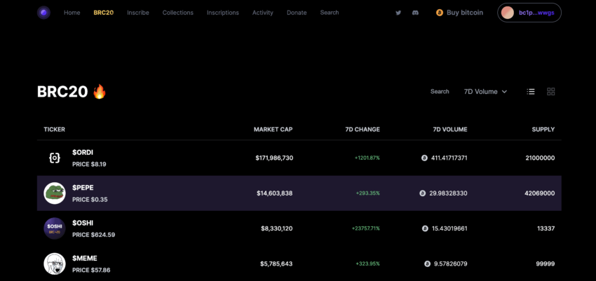 Se você notar moedas como SHIB e PEPE na lista, não fique muito animado, pensando que eles estão sendo negociados a um preço diferente nesta blockchain BRC-20. Eles são apenas tokens SHIB e PEPE falsos, e os cunhadores de tokens BRC-20 simplesmente usaram seus nomes para colocá-los na rede Bitcoin.