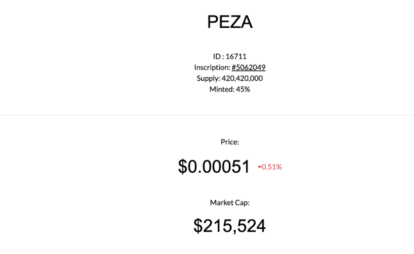 Aqui está um token PEZA com uma oferta total de 420,42 milhões. Desse total, apenas 45% foram cunhados, possibilitando a cunhagem de novos tokens BRC-20.
