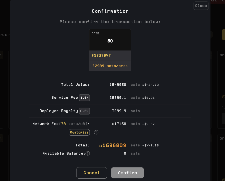 Aqui estamos tentando comprar 50 ORDI, pagando uma taxa de rede de quase US$ 4,52, uma taxa de serviço de 1,6% e royalties de desenvolvedor de 0,2%.