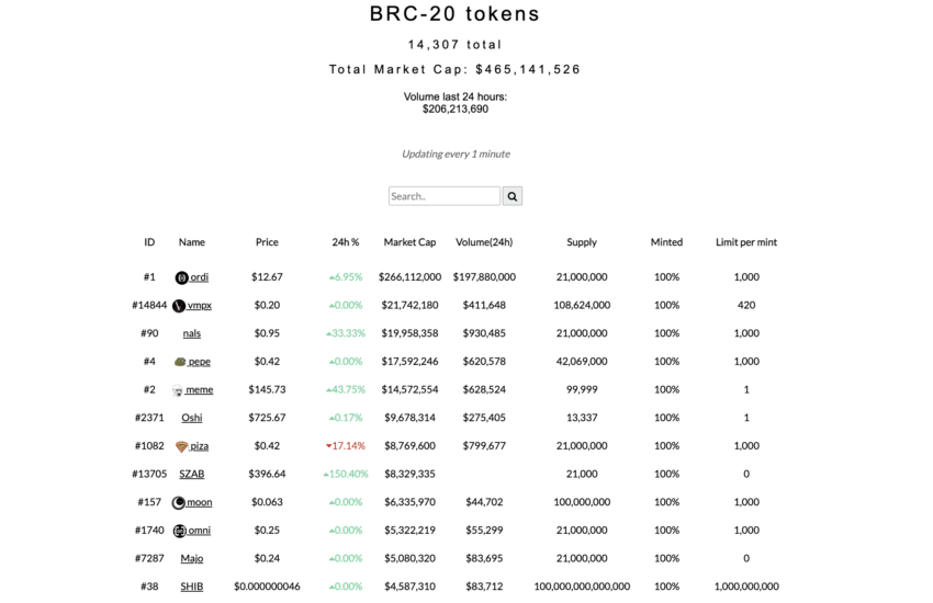 Em meados de maio de 2023, a capitalização de mercado desses tokens ultrapassou US$ 465 milhões. Mas não é isso. Aqui está uma lista dos tokens BRC-20 populares que estão fazendo todo o barulho: