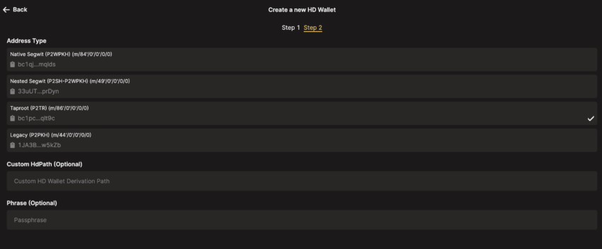 Você deve selecionar o endereço Taproot como único que suportará os tokens Ordinais e BRC-20 para você.