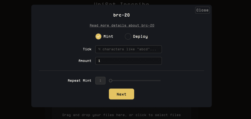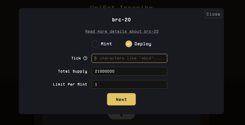 Vimos o script JSON de implantação ou criação de token anteriormente. Quando você vai para um mercado ou carteira BRC-20 compatível, digamos UniSat, você pode clicar em implantar. Depois de seguir as instruções na tela, você pode criar seu próprio token BRC-20. Após a criação e atribuição de características ao token – digamos, suprimento máximo e limite de cunhagem – você pode começar com a cunhagem.