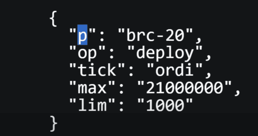 Aqui está a primeira instância do tipo de dados JSON inscrito no Sat. Observe que ele tem todos os elementos listados – protocolo, operação (para começar), ticker (ORDI, o primeiro token BRC-20), suprimento máximo e limite de hortelã.