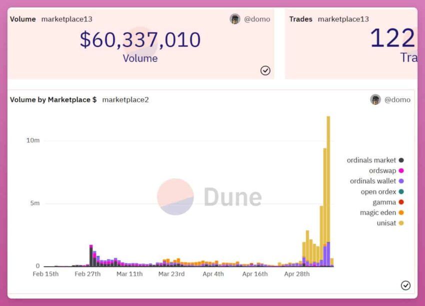 De acordo com dados do Dune, o UniSat vê mais ação no que diz respeito aos mercados BRC-20.
