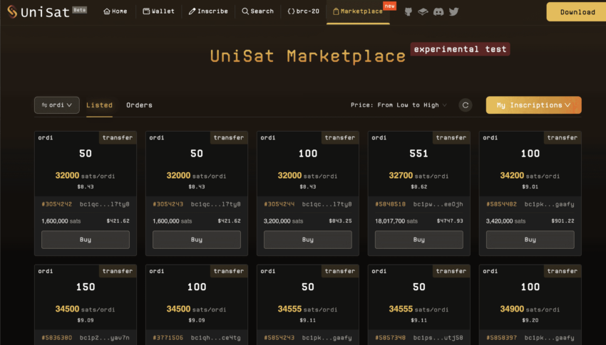 Em alguns casos, você precisará de pelo menos 20 pontos UniSat para acessar o marketplace. Isso significa que você implantou ou cunhou tokens antes de entrar no mercado de compra. Esse enigma de 20 pontos UniSat foi uma das principais razões para elevar os preços da rede, pois cada ponto significa uma inscrição em um Sat ou uma transação – o que bloquearia algum espaço na rede.