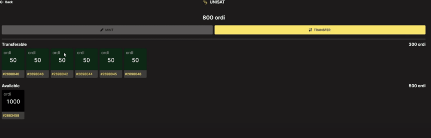 Sua carteira UniSat informará a quantidade de tokens que você pode transferir.