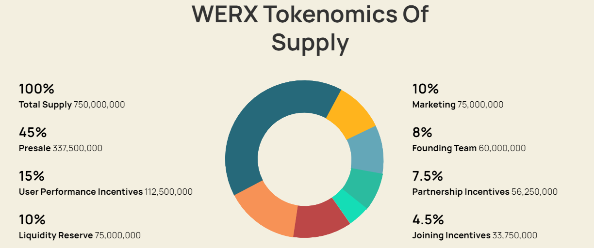 WERX é o token nativo para a plataforma Uwerx. Possui um suprimento total de 750 milhões de tokens. A distribuição do token é a seguinte: