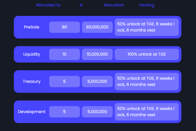 – 50%: Vendido na pré-venda. Esta venda destina-se a arrecadar fundos para o desenvolvimento de projetos e esforços de marketing.