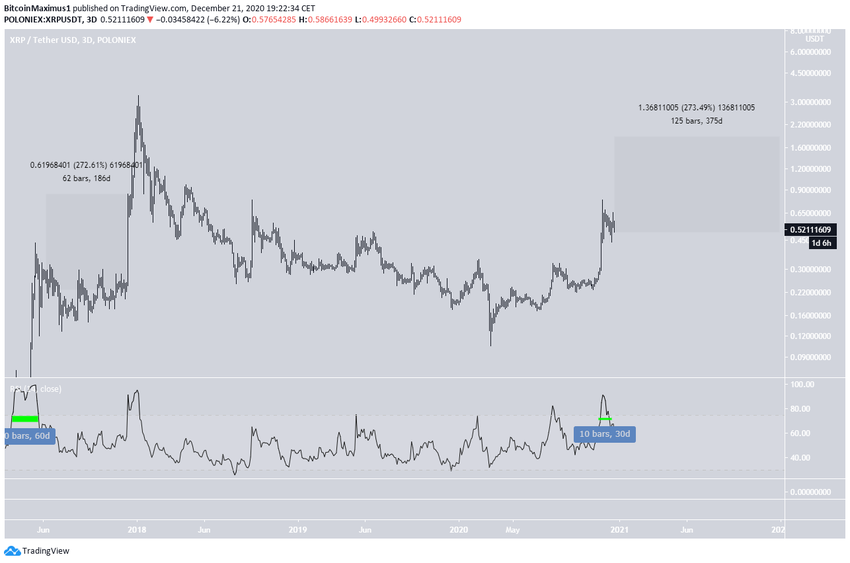 No entanto, o movimento dos preços torna improvável que a mesma taxa de aumento continue em 2021, devido ao forte impulso que levou o preço do XRP de US $ 0,25 para US $ 0,70 em questão de dias.