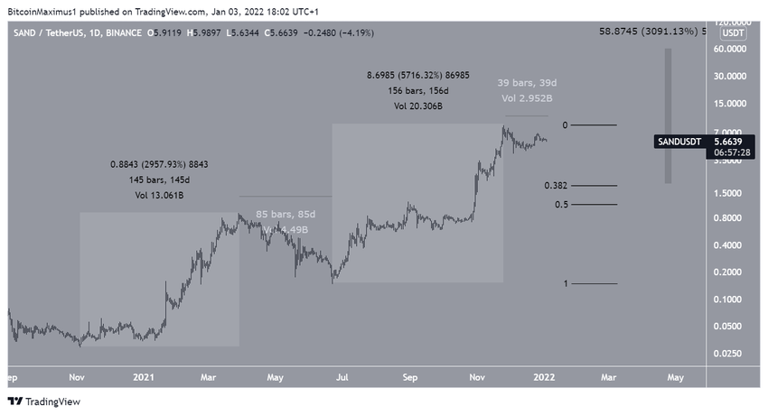 O primeiro movimento de alta para SAND ocorreu entre novembro de 2020 e março de 2021. Ele continuou por 145 dias, nos quais SAND aumentou quase 3.000%. Posteriormente, o token esteve em tendência de correção até julho.