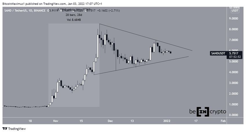 O preço do SAND tem caído desde que atingiu a maior alta de todos os tempos de US $ 8,84 em 25 de novembro. A queda tomou a forma de um triângulo simétrico, que é considerado um padrão neutro. Portanto, tanto um breakout quanto um breakdown podem ocorrer.