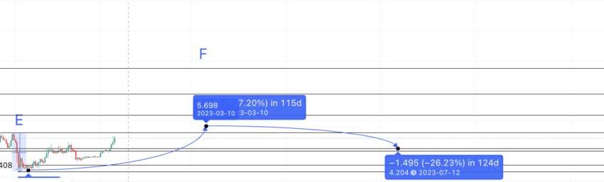 De acordo com as tabelas de dados, se marcarmos a próxima alta após E como F, o nível pode chegar a US$ 5,698. Observe que F ainda é menor que E, o que significa que o APE, mesmo em março de 2023, pode não formar um padrão alto mais alto. A queda de F pode chegar a um mínimo de 57,92% em 124 dias.