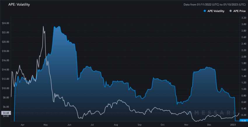 Desde o seu lançamento, a volatilidade da ApeCoin parece ter caído. Os preços também caíram desde as máximas de março de 2022. Mas a volatilidade decrescente pode ser uma boa notícia para o preço futuro de curto prazo do APE.