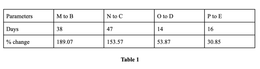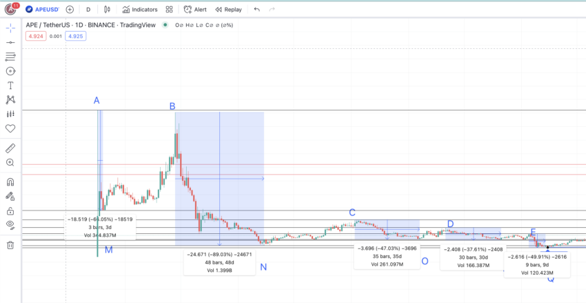 A distância média e variação de preço de um baixo para um alto chega a ser: 29 dias (o máximo é 47 dias) e 106,84%. A distância pode variar, pois não há muitos dados históricos para APE. Além disso, o mercado de criptomoedas está relativamente fraco no momento. A distância total de M a E é de 115 dias, que também pode ser onde a próxima alta aparece.