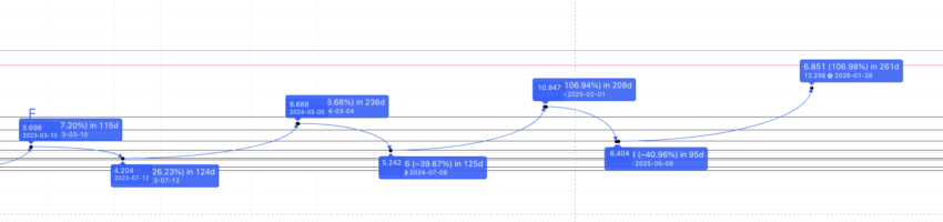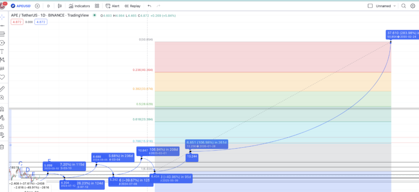 Se você observar atentamente as previsões de preço da APE para 2023, 2024, 2025 e 2026, a formação de máximas mais altas é evidente. Agora que temos a máxima de 2026 e a mínima de 2025 à nossa disposição, podemos extrapolar o caminho até 2030 usando os níveis de Fibonacci.