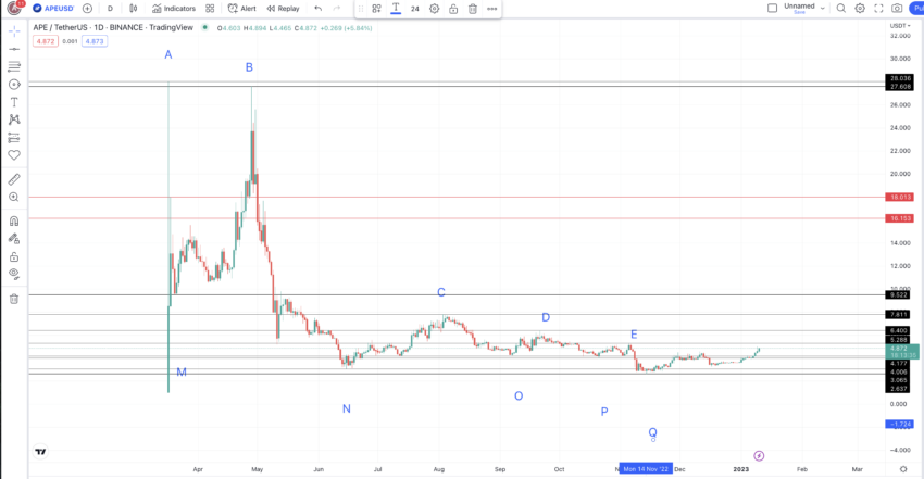 Aqui está o gráfico marcado com todos os pontos-chave identificados. Observe que esses níveis também podem atuar como principais linhas de suporte e resistência quando se trata do preço futuro do APE. Agora é hora de traçar o caminho de A a Q, incluindo todos os altos e baixos.