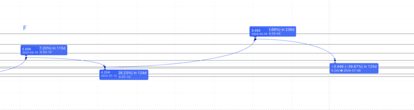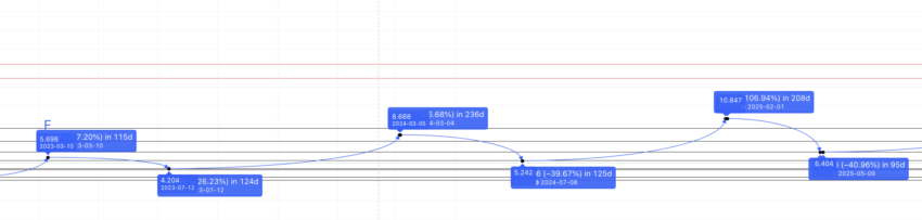 A distância, no entanto, pode chegar a 230 dias – M a E é de 115 dias e E a F é de 115 dias – dependendo do estado do mercado de criptomoedas e do caminho de crescimento anterior da ApeCoin.