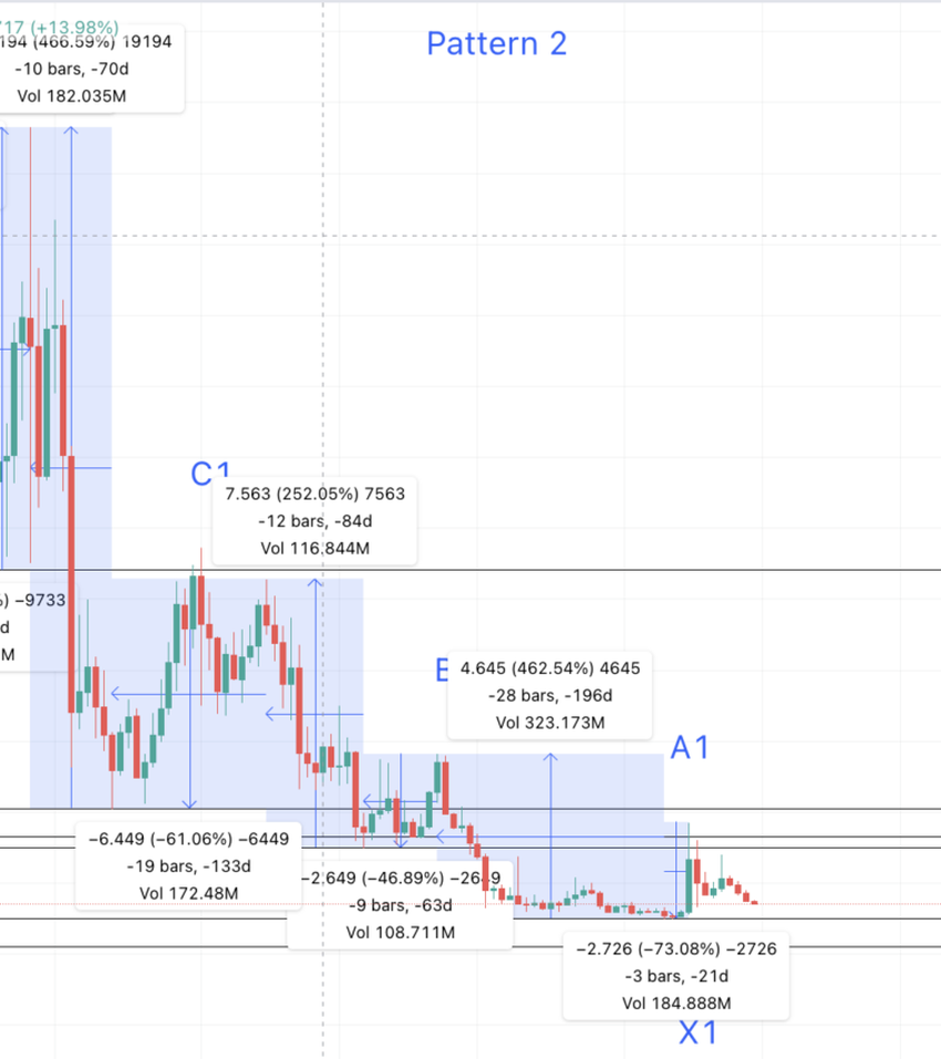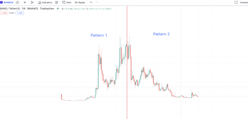 Observe que as duas zonas circundadas parecem semelhantes em termos de movimento. Isso mostra que o gráfico semanal do BAND pode estar sendo negociado em um padrão espelhado. Agora podemos dividir o gráfico em Padrão 1 e Padrão 2.