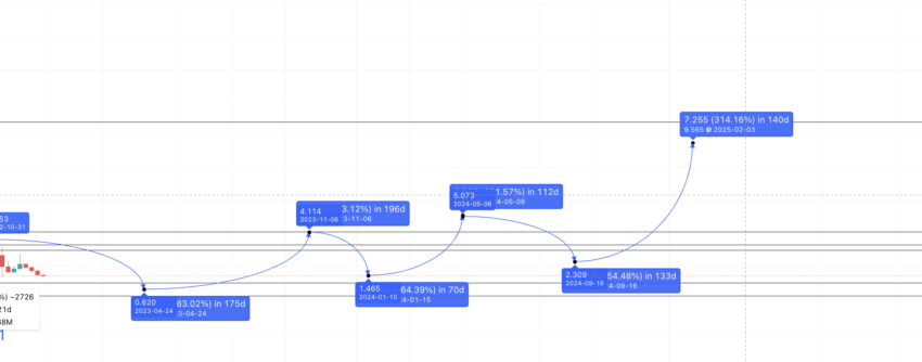 Observe que colocamos esse ponto em 2025. Após o mercado de baixa, um movimento de 300% pode levar um pouco mais de 70 dias.
